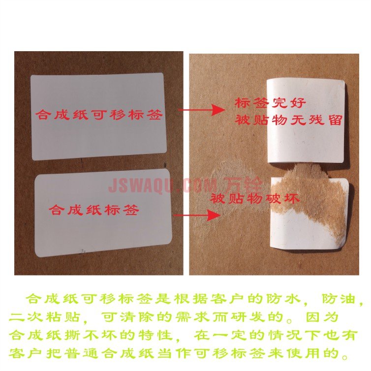 • 可移除标签又叫做环保型标签、N次贴标签、可揭不干胶、可移性标签、可移贴纸,他在撕去时不会产生痕迹,采用可移胶制作  ,可以很容易的从一个背贴物上面揭开然后粘在另外一个背贴物上面,标签完好无损,可以多次重复使用。